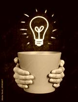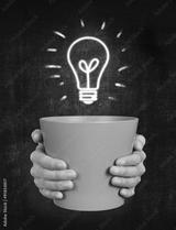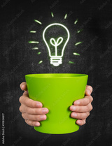 hands holding plant pot with lamp isolate on chalkboard ,with gl