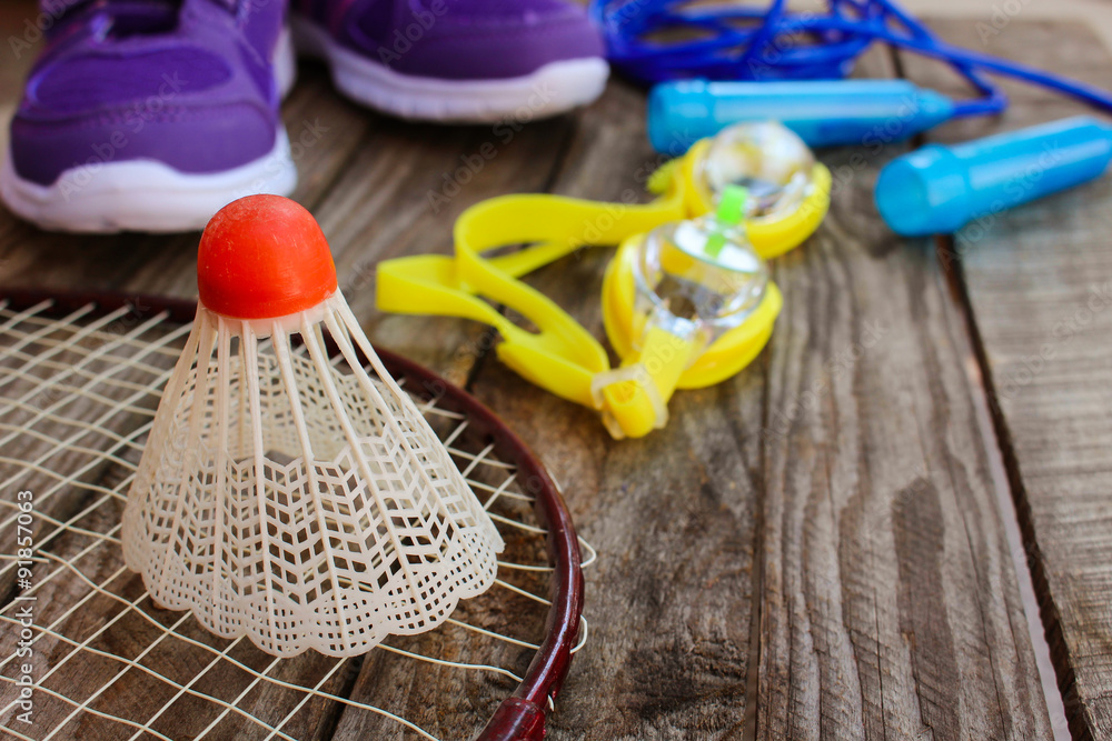 Sports equipment: the birdie is on the racket, skipping rope, swimming goggles and sneakers on wooden background