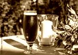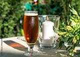 Cold dark beer on restaurant table, craft porter beer, ale froth pint glass in garden on a sunny summer day