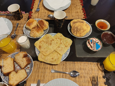 Moroccan breakfast ftour, msemen, baghrir, orange juice, pastries, table setup morning meal traditional dishes