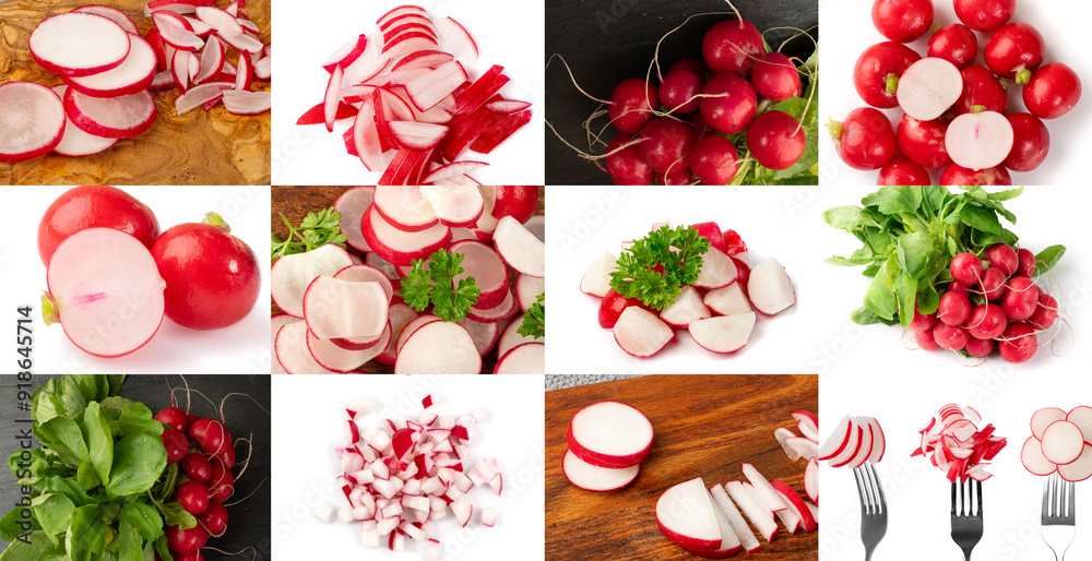 Radis mix, red radish root collage, cuts, diced red radishes closeup, sliced fresh radis root bundle