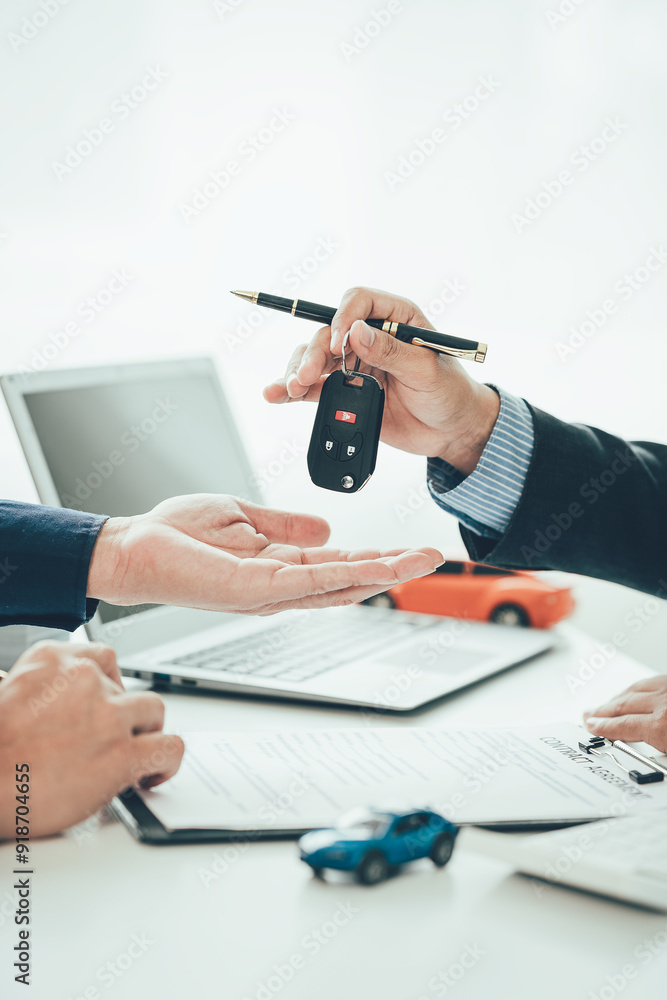 Salesperson at a table in a showroom Customer and new car, male car salesman stands beside and gives her advice Inside the shop where people sell cars Close-up pictures