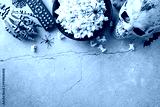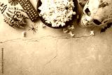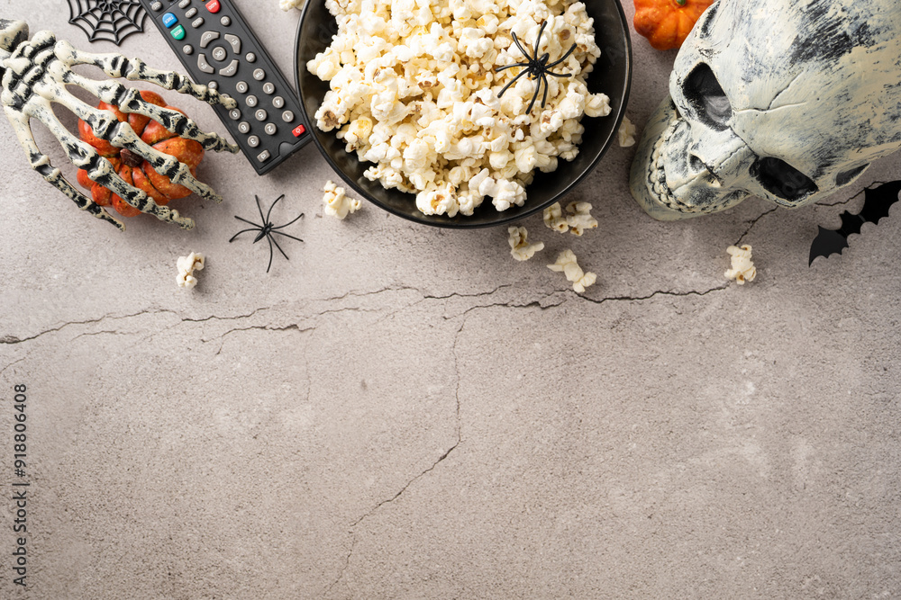 Halloween-themed setup featuring a bowl of popcorn, remote control, skeleton hand, skull, and spider decorations on a concrete background