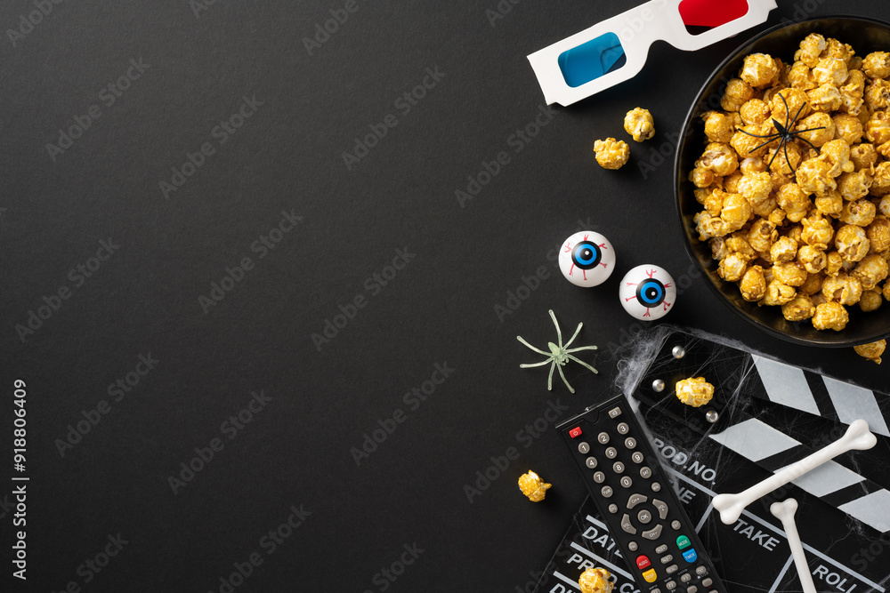 A Halloween-themed movie night setup with popcorn, remote control, spooky decorations, and 3D glasses on a dark background