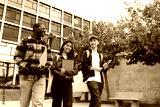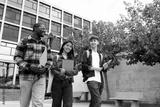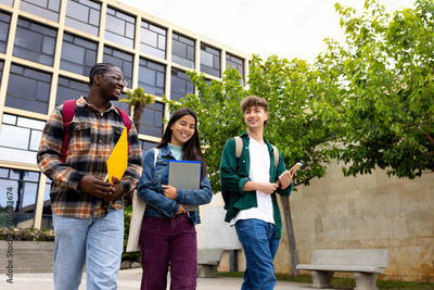 Group of multiracial happy college students walking together and talking in college campus