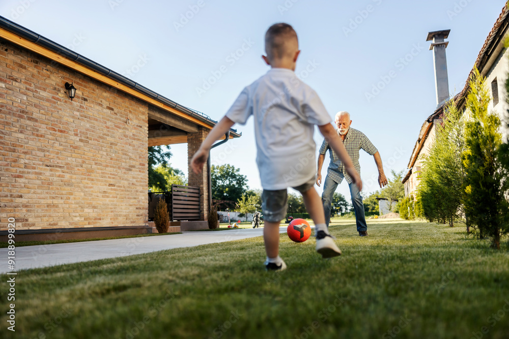 Fun grandfather and grandson playing soccer in backyard on the lawn.