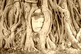 Famous Buddha head tangled in the ficus tree roots in Ayutthaya, Thailand