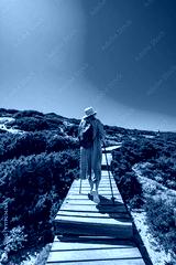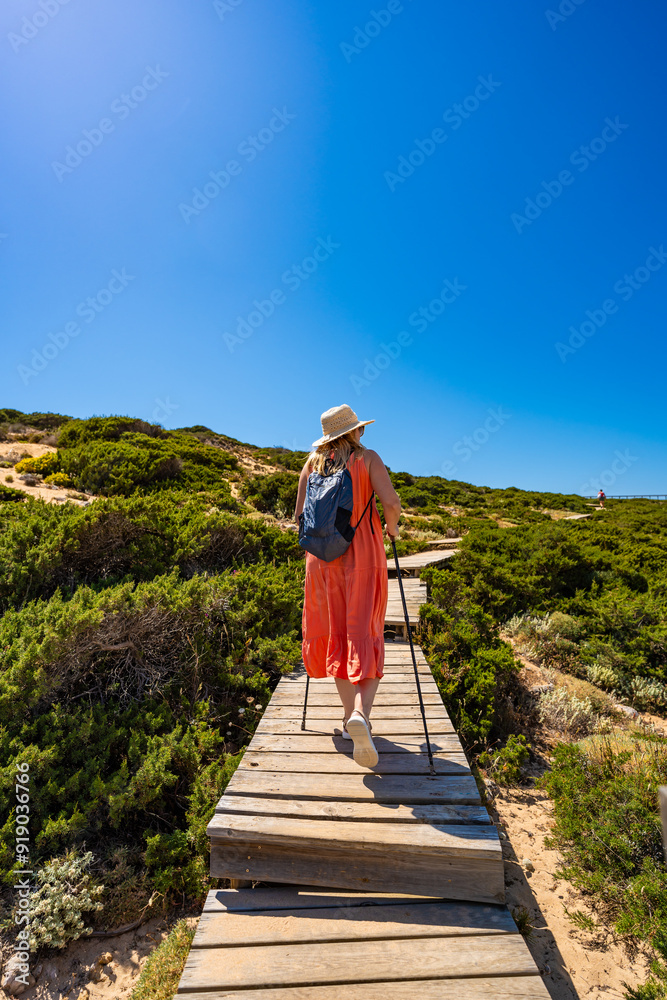 Footbridge to Bordeira Praia. Young woman tourist in orange long dress and sun hat with backpack practicing Nordic walking on wooden walking path among seaside vegetation leading to beach in Portugal.