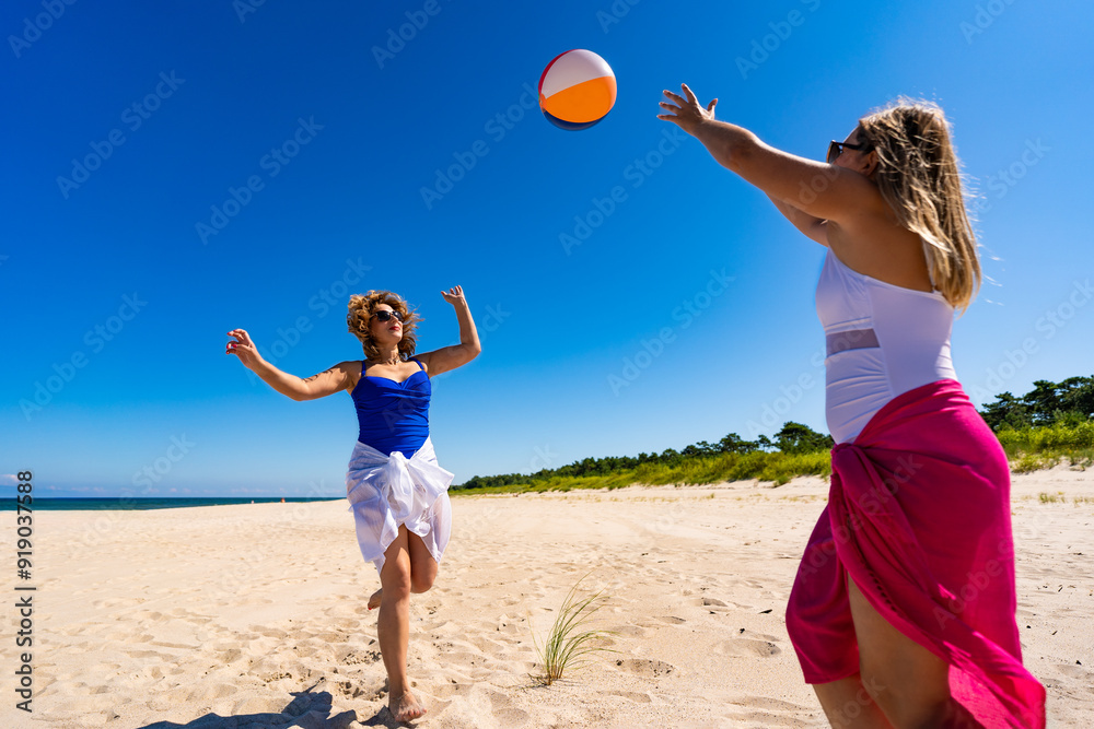 Joyful summer. Two young pretty women wearing swimsuits and sarong playing multicolored ball on sandy beach against blue sky in summertime. Energy, happiness and activity.