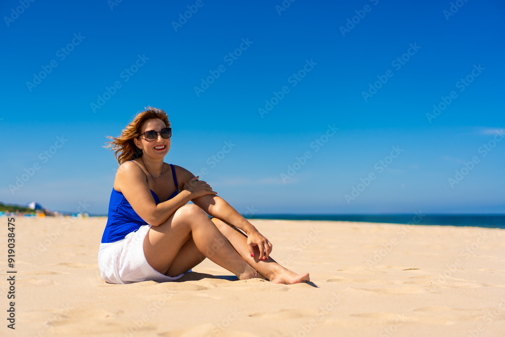 Summer holidays. Beautiful young woman in blue swimsuit and white pareo and sunglasses sitting on ground on sandy beach against backdrop of blue sky. Side view