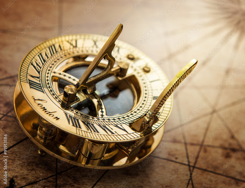 Old compass on vintage map. Retro stale.