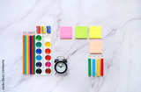 set accessories and stationery on marble table background. Back to school, education concept. symbol of creativity, artistic art. top view. copy space. template for design