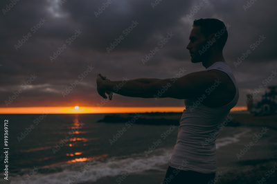 Young strong sporty athletic toned fit sportsman man he wear sports clothes do hand stretch lunge exercise warm up training at sunrise sun dawn over sea beach outdoor on seaside in summer day morning.