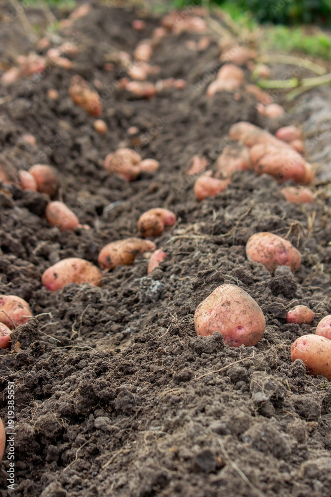 Fresh potatoes on the field. Harvesting organic potatoes. Agriculture and farming