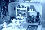 retro-style miniature dollhouse scale kitchen roombox with handcrafted furniture, dishes and utensils, miniature enthusiasts
