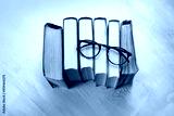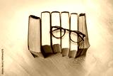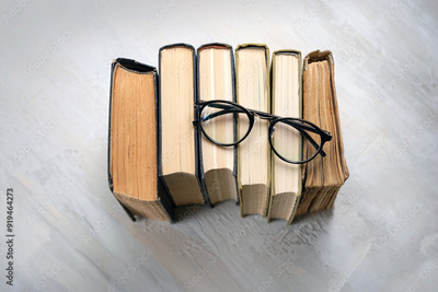 eyeglasses and few old books on table. love of reading, learning new knowledge concept. top view. template for design
