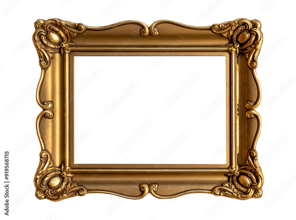 Simple empty blank gold decorative horizontal painting frame on a museum wall, copy space middle cut out, template, mockup. Art exhibition framing golden old fashioned classical ornament style design