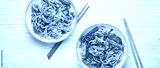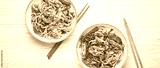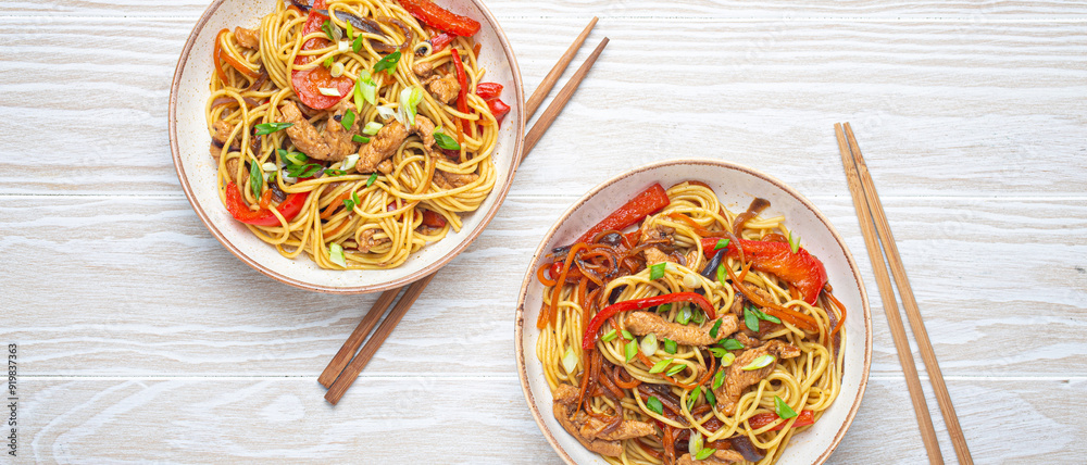 Two bowls with Chow Mein or Lo Mein, traditional Chinese stir fry noodles with meat and vegetables, served with chopsticks top view on rustic white wooden background table.