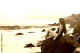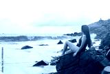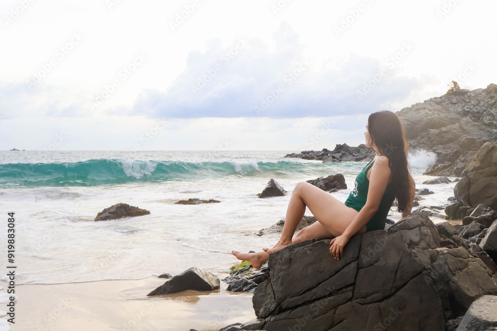 Woman on a rock watching at the landscape in the beach. Watching the waves and blue water.