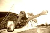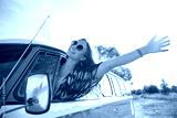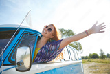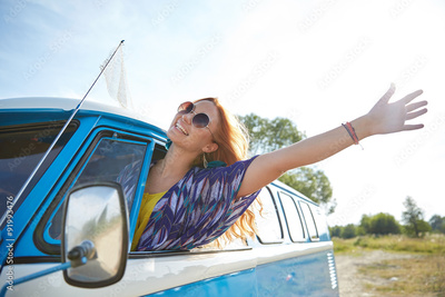smiling young hippie woman driving minivan car