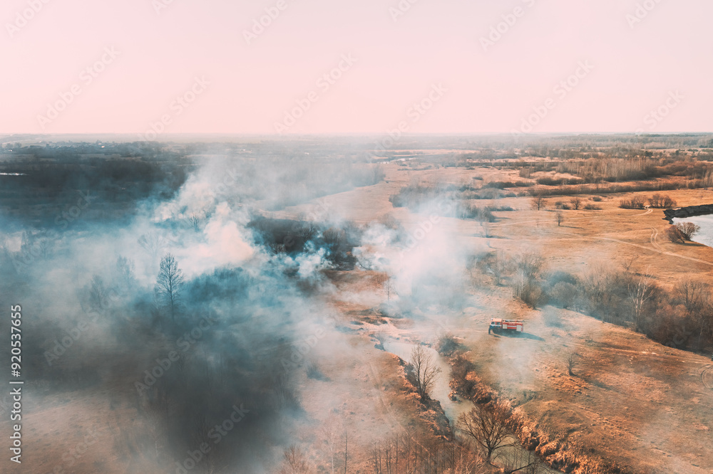 Nature In Danger. Wild Open Fire Destroys Grass. Natural Disaster. Firefighters Put Out Fire. Aerial View Of Dry Grass Burns During Drought And Hot Weather. Bush Fire And Smoke In Meadow Field