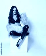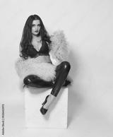 Beautiful sensual brunette woman with long hair wearing black leather pants, high heels and a white fluffy coat posing against white studio wall background