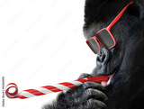 Funny gorilla with red sunglasses celebrating a party by blowing a striped horn