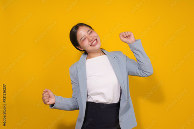 Young businesswoman is joyfully celebrating a triumph, her enthusiastic movements reflecting her positive energy and achievement