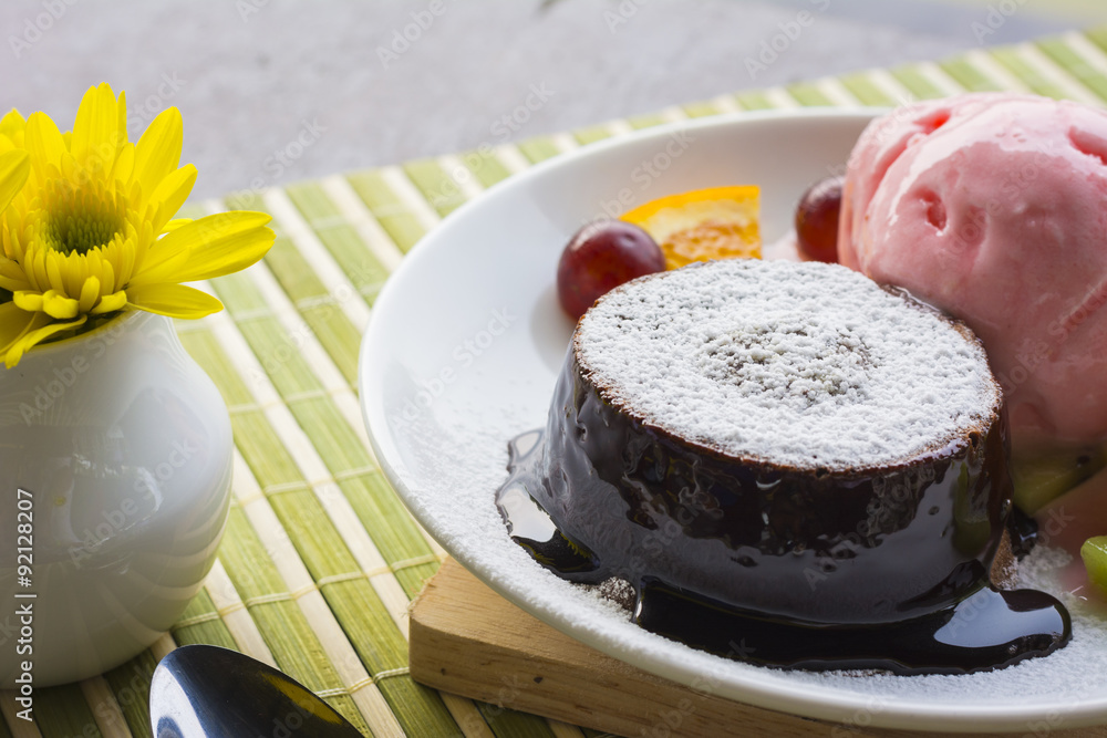 Chocolate pudding Served with fresh fruit and Strawberry ice cre