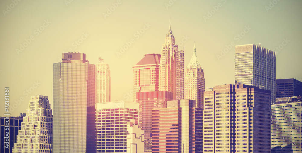 Vintage toned panoramic picture of Manhattan at sunset, USA.