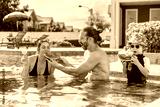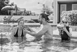 Happy vacation kid boy and father eat watermelon have fun enjoy at swimming pool. children and parent cheerful activity relaxing in summer holiday.