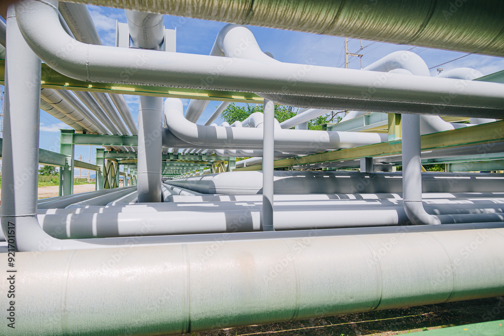 Oil refinery gas pipe. Large diameter pipelines transport oil products to and from refinery plant.