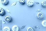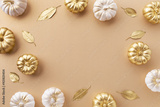 Stylized white and gold decorative pumpkins and golden leaves on a pale beige background for autumn and Thanksgiving cards.