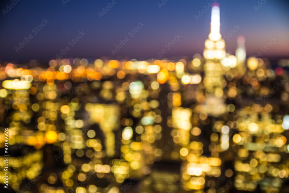 Defocused blur of New York City buildings lights at night