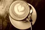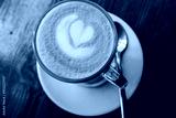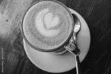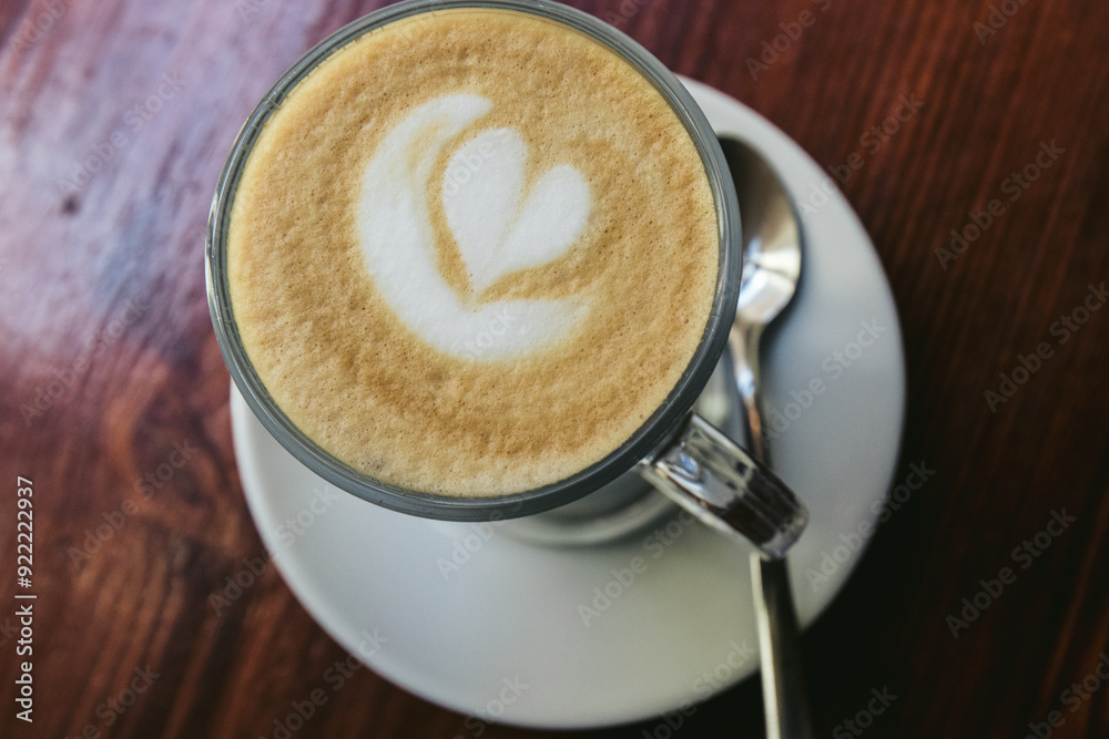 Top view of hot coffee latte art foam heart in glass cup on a saucer with a spoon, on the wooden table. Wake up and fill full energy. Breakfast. Relax time in cafe, coffee shop.