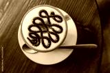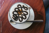 Top view of hot coffee latte art foam in white cup on a saucer with a spoon, on the wooden table. Wake up and fill full energy. Breakfast. Relax time in cafe, coffee shop.