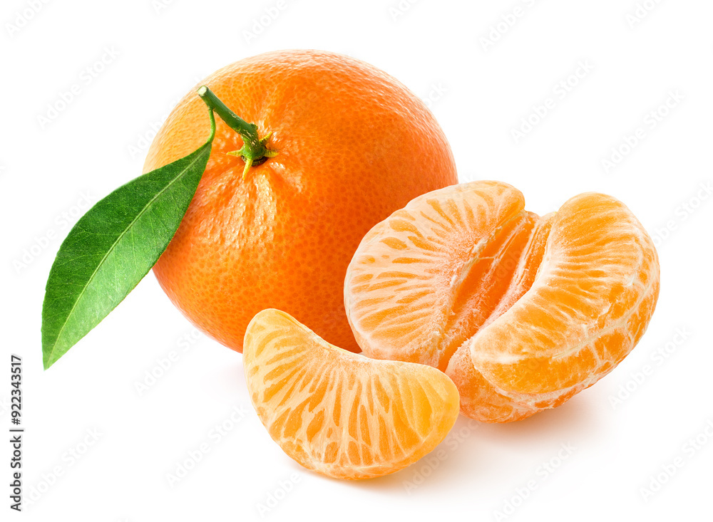 One whole, half and peeled piece of tangerine, mandarin or clementine on white background.