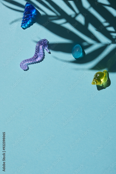 Marine transparent colorful figurines or kid's toys on the blue background with tropical palm leaves shadows. Summer sea vacation concept composition. Copy space