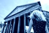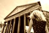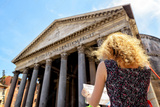 Girl looks at tourist map at famous Roman Pantheon, Rome, Italy
