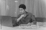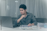 Asian businessman working overtime to analyze finances, working on budget. Calculating with a calculator in the office at night