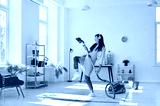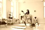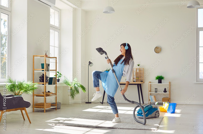 Young funny smiling woman housewife with earphones cleaning home with vacuum cleaner having fun, dancing and listening to music in living room while doing housekeeping work vacuuming carpet.