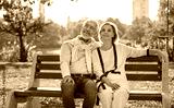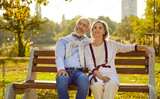 Happy smiling senior couple family sitting on the bench in city park and looking into the distance enjoying retirement and spending time together in nature. Elderly people relationship concept.