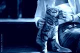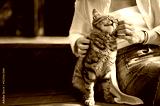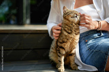 cute striped domestic cat basks in the sun sitting on a ladder step, light-skinned woman's hands pet a brown-striped house cat who smiles like the Cheshire Cat