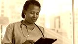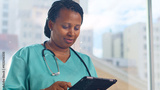 Confident Female Doctor Using Digital Tablet for Patient Information in Modern Medical Office