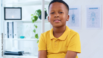 Young Boy in Yellow Shirt Sitting in Medical Office Smiling During Doctor Visit for Routine Checkup