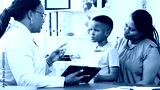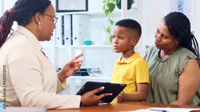 Doctor Consults Concerned Mother and Child in Modern Medical Office Environment