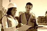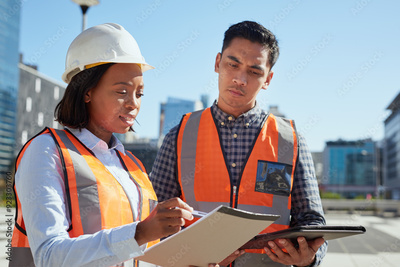 Diverse Construction Workers Reviewing Plans at an Urban Construction Site