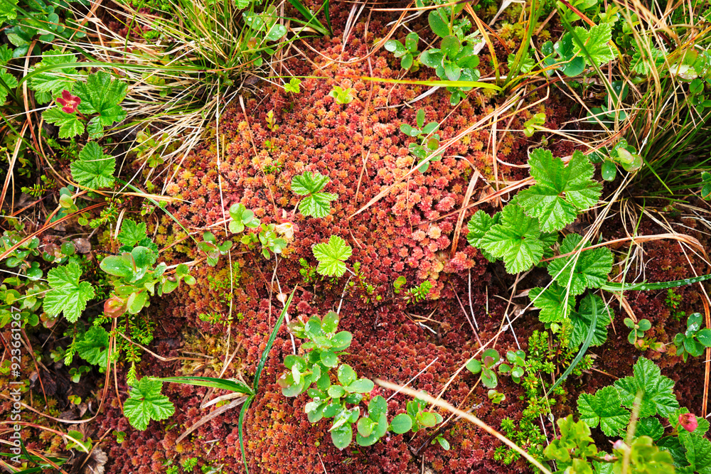 A close-up view of a vibrant forest floor, featuring a rich tapestry of green leaves of Cloudberry, red Sphagnum moss, and various small plants.