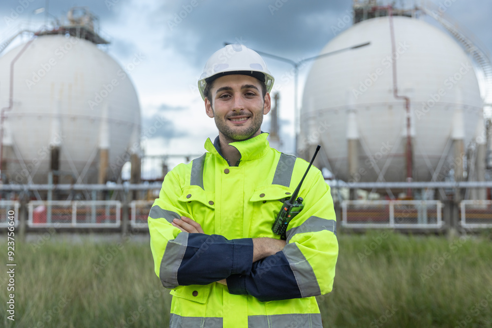 Portrait success man professional engineer technician smiling wear safety uniform and white hard hat arms crossed looking at camera stand area near tank refining oil petrochemical industry factory.