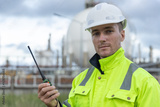Man professional engineer technician wear safety uniform and white hard hat working area near tank refining oil petrochemical industry factory. Industrial factory site energy power station.